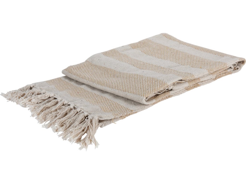 Pléd/přehoz - materiál 100% bavlna, rozměry 130x170cm, barva béžová s černý s linkami.