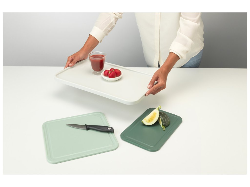 Kompletní sada obsahuje malé (S - 16 x 25 cm), střední (M - 25 x 25 cm) a velké (L - 40 x 25 cm) prkénko. Multifunkční použití každého prkénka nabízí jednu stranu na krájení a druhou na servírování. Drážky zabraňují rozsypání a měkké protiskluzové okraje zajišťují, že desky nekloužou a nepoškrábou povrchy.