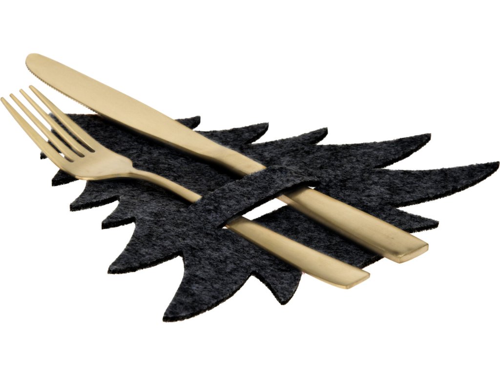 Držáky jsou vyrobeny z kvalitní černé plsti, která na stole vytváří dramatický kontrast. Tento tmavý, ale hřejivý materiál je perfektním pozadím pro lesklé zlaté nebo stříbrné příbory (jak vidíte na ilustračním obrázku), čímž podtrhnete jejich eleganci. Každý plstěný stromek o rozměrech 200 x 180 mm má přesný střih a šikovnou kapsu pro uložení nože a vidličky, což přispívá k čistotě a organizaci slavnostního stolu.