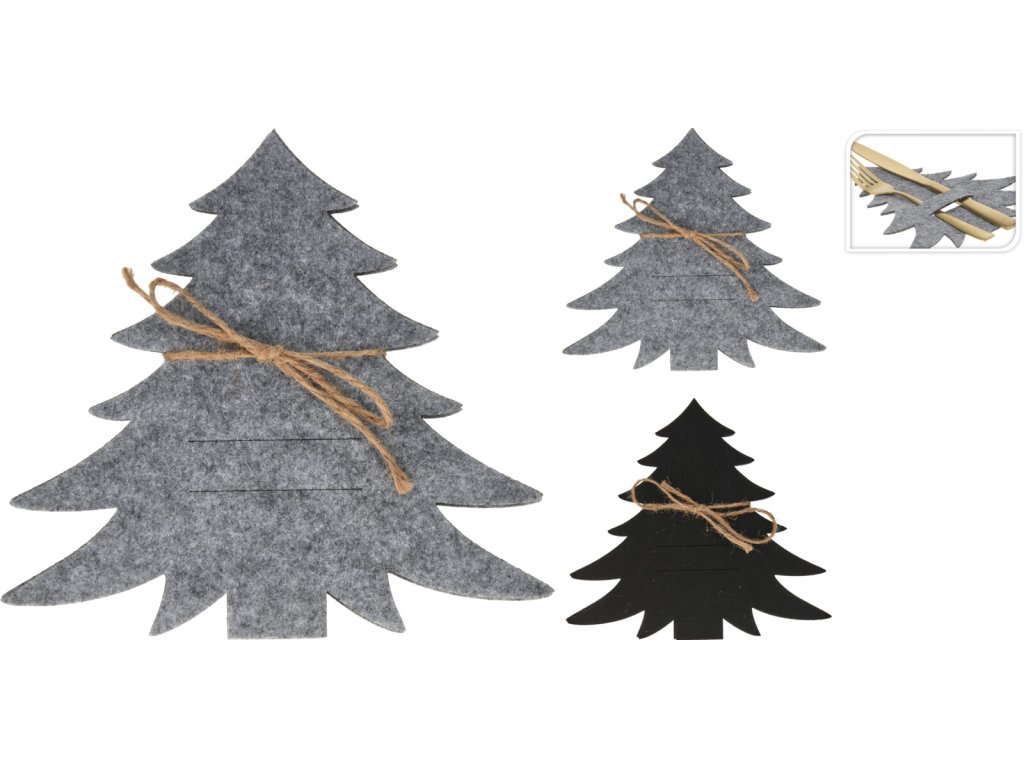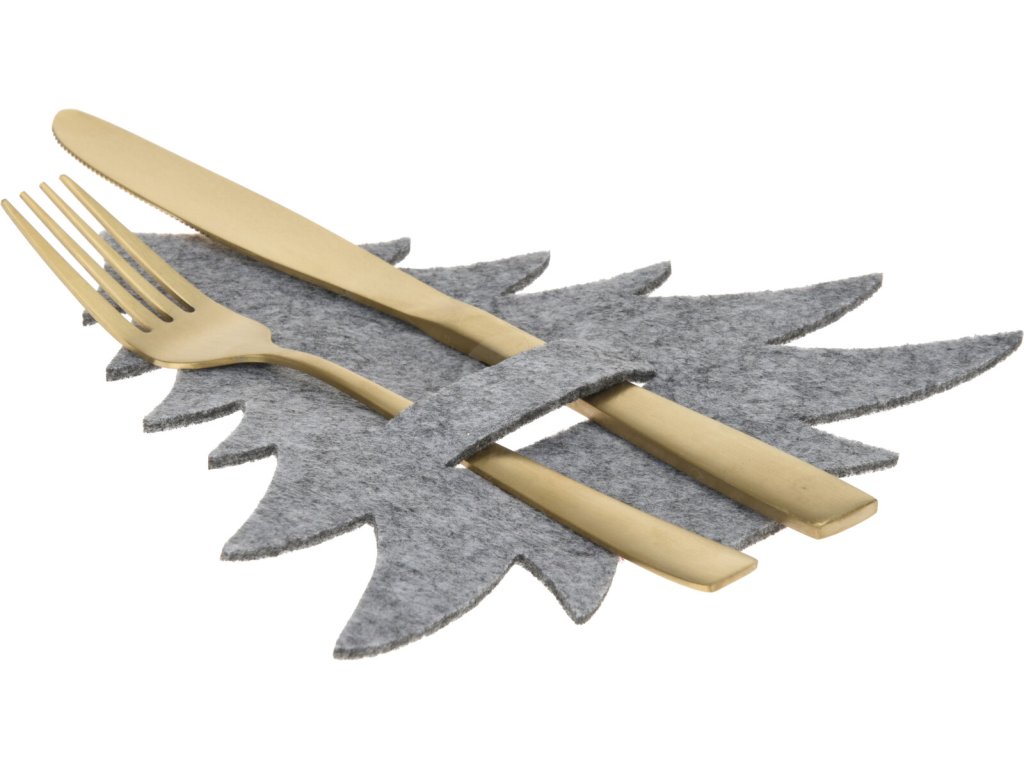 Držáky jsou vyrobeny z kvalitní šedé plsti (filcu), která dodává celému stolu hřejivý a útulný vzhled. Šedá barva je neutrální a perfektně zapadá do skandinávského či rustikálního vánočního stylu, kde doplňuje bílé nádobí, dřevo a přírodní materiály. Každý držák na příbory je pečlivě vyřezán do siluety jedličky o rozměrech 200 x 180 mm a obsahuje speciální plstěnou kapsu pro zasunutí nože a vidličky.