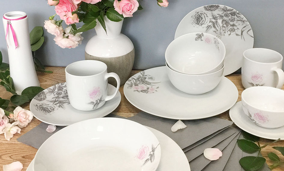 Kolekce porcelánového nádobí ROSE české značky by inspires ...porcelán s českou duší. Motiv růží v šedorůžové kombinaci dodává talířům elegantní a slavnostní atmosféru. Tato růže Vám nikdy neuvadne a vždy potěší při každé příležitosti u prostřeného stolu.