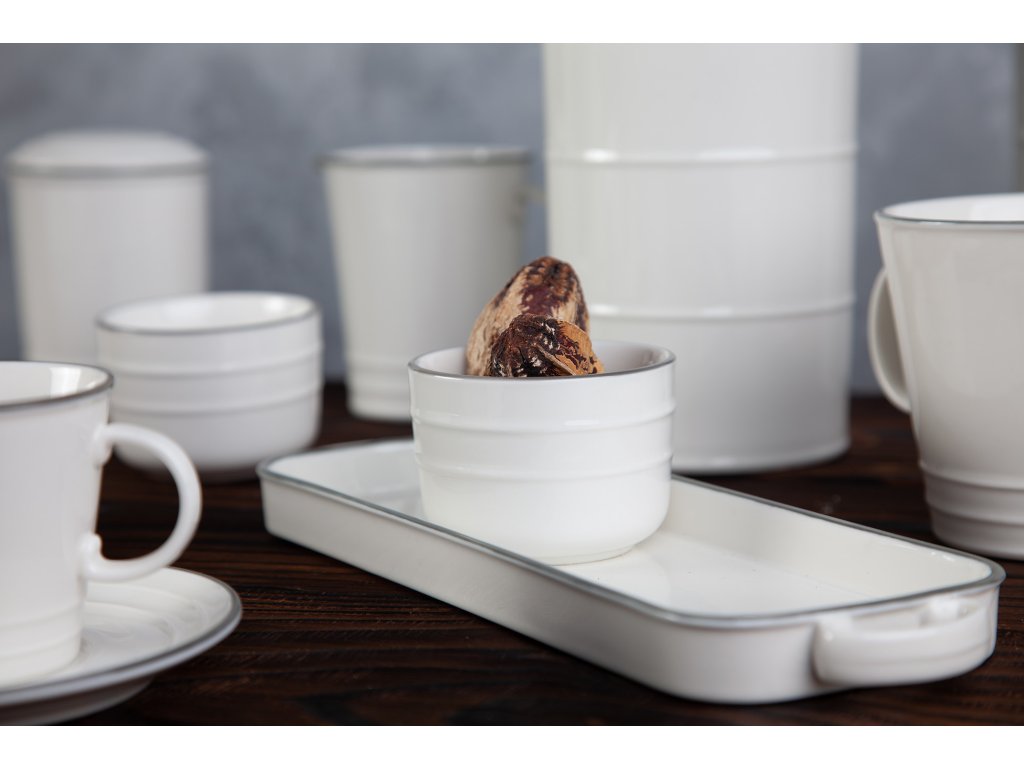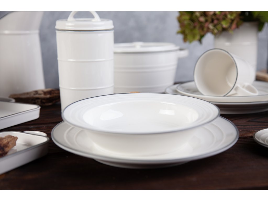 Design, který si pohrává s netradiční kombinací tvaru a materiálu. Tvar tak typický pro smaltované nádobí našich babiček a použitý materiál jakostní porcelán, působí mile a vlídně. Porcelánová polévková mísa má smetanový nádech a elegantní šedý proužek jen podtrhuje kontrast křehkosti a retro tvaru „kovového“ nádobí. Designová mísa v nadčasovém provedení. Moderní mísa na polévku nebo salát od české značky by inspire...porcelán s českou duší.