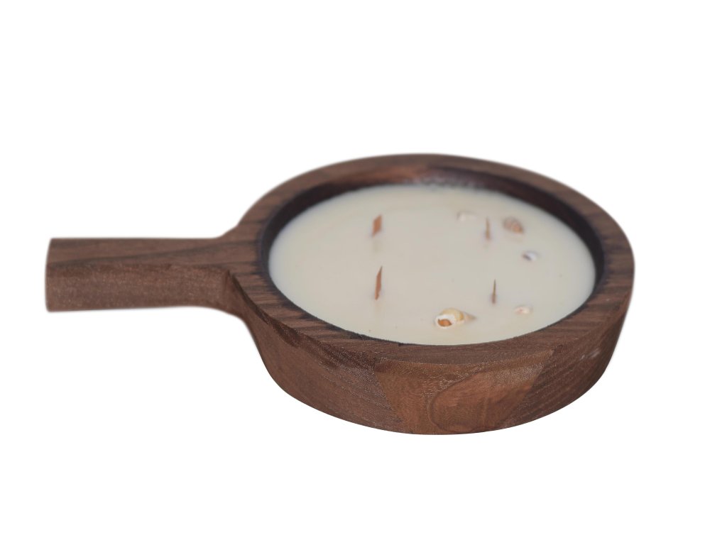 Vytvořte si útulnou a hřejivou atmosféru s Dekorativní svíčkou FlamePan. Tato svíčka je zasazena do originální dřevěné misky, jejíž design je inspirován tvarem rustikální pánve s krátkou rukojetí. Miska je vyrobena z oblíbeného Paulovnie dřeva, které je surové a mořené do tmavšího odstínu, což zvýrazňuje jeho texturu a dodává celku sofistikovaný a zemitý tón.
