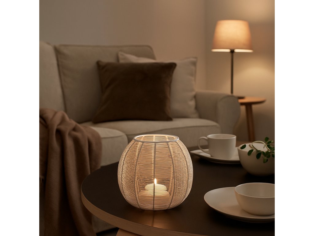 Doporučujeme použít LED svíčku nebo čajovou svíčku, které v kombinaci s bílým výpletem působí mimořádně útulně. Díky svému neutrálnímu tónu je také skvělým celoročním dárkem nebo doplňkem k jiným svícnům a dekoracím.