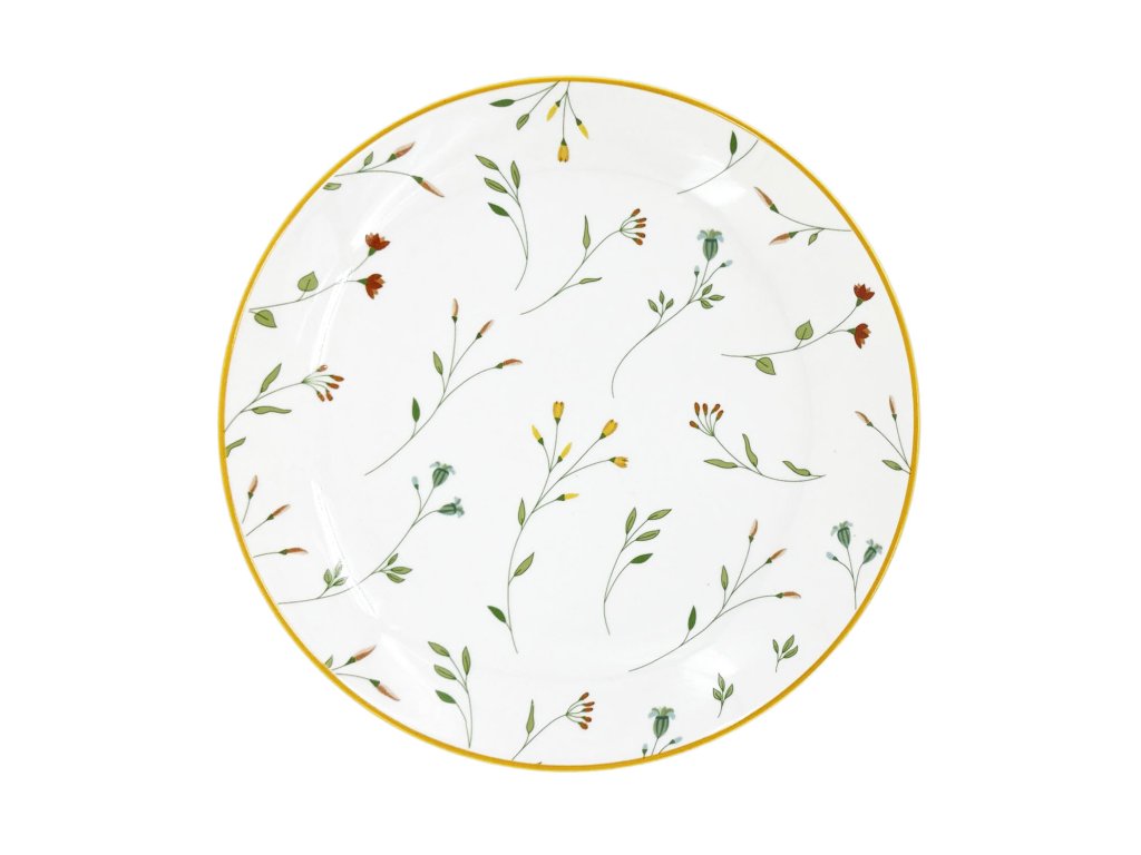 Bílý porcelánový talíř zdobí rozptýlený dekor drobných, pestrobarevných lučních kvítků a bylinek, které se volně vznáší po celé ploše talíře a vytvářejí efekt svěžího jarního závoje. Vzor pokrývá rovnoměrně celou plochu od okrajů až ke středu. Celý design je orámován jasným a sytým žlutým okrajovým lemem, který dodává talíři veselý a jiskrný akcent. Stejně jako ostatní kousky z kolekce, i tento dezertní talíř se dá harmonicky kombinovat s čistým porcelánem Linea Yellow (bílý porcelán se žlutou okrajovou linkou), čímž vytvoříte elegantní a světlý servis na svačinu.