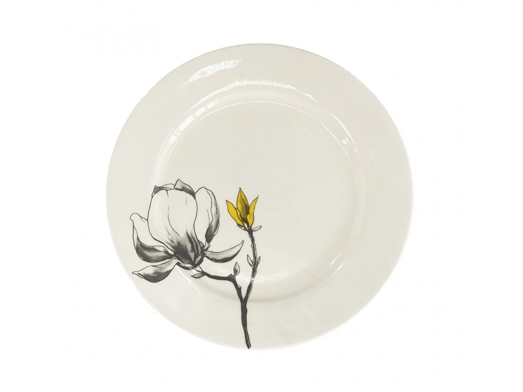Dezertní talíř Fine Twig, bílá s dekorem magnolie v šedožluté barevné kombinaci.