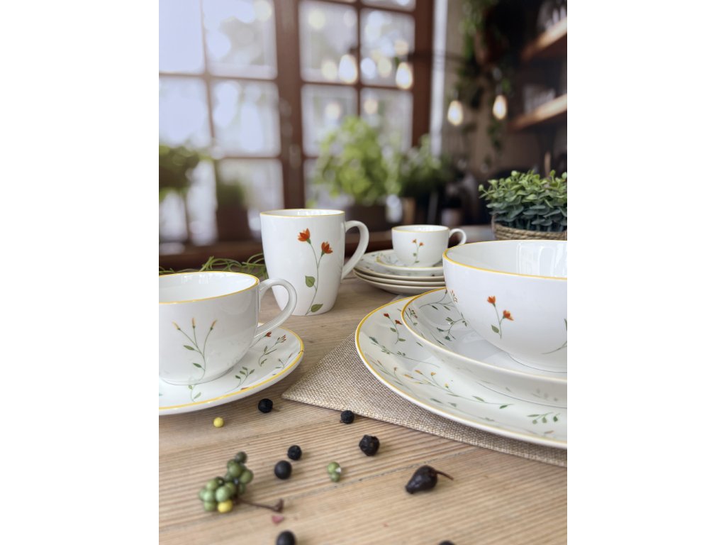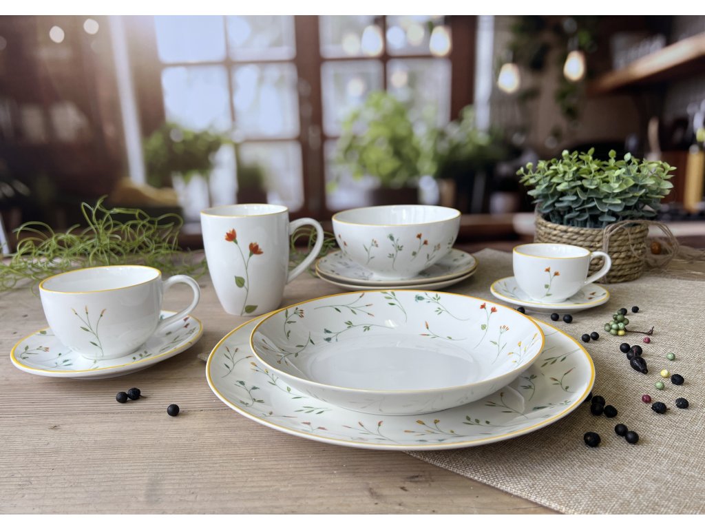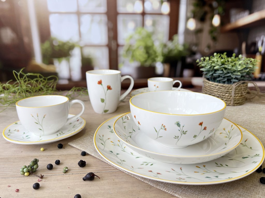 Design tohoto porcelánového hlubokého talíře je jedinečný. Luční květinový dekor je pečlivě soustředěn pouze na vnější okrajovou část, zatímco hluboké dno talíře zůstává čistě bílé. Tím je dosaženo kontrastu, který nechá plně vyniknout barvu a texturu servírovaného pokrmu. Celý botanický motiv je orámován jasným žlutým okrajovým lemem, který dodává porcelánu teplo a jas. Pro vytvoření hravého a slunečného setu lze talíř skvěle kombinovat s čistým porcelánem Linea Yellow (bílý porcelán se žlutou okrajovou linkou).