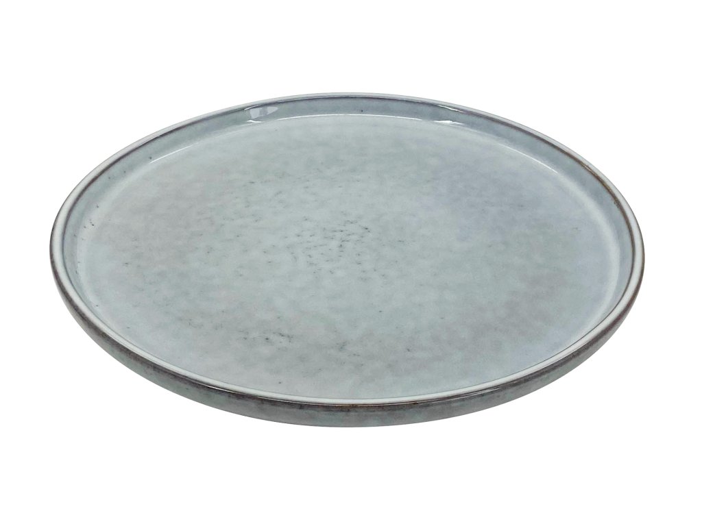 Mělký kameninový talíř se stříkanou glazurou v šedé barvě.