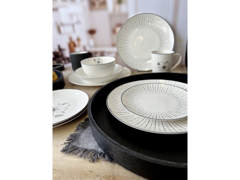 Dominantou talíře je unikátní grafický dekor tvořený paprsky přerušovaných čar (tzv. "dash"), které se elegantně rozbíhají od středu talíře k okraji. Tento moderní vzor vytváří optický klam pohybu a dodává prostírání nečekanou energii. Kontrastní černý okraj pak vizuálně rámuje talíř a dokonale propojuje design s celou řadou Linea Dash. Pokud vás zajímá minimalistický porcelán s grafickým vzorem, je to přesně to, co hledáte. Perfektně doplní jak skandinávský, tak industriální styl bydlení.