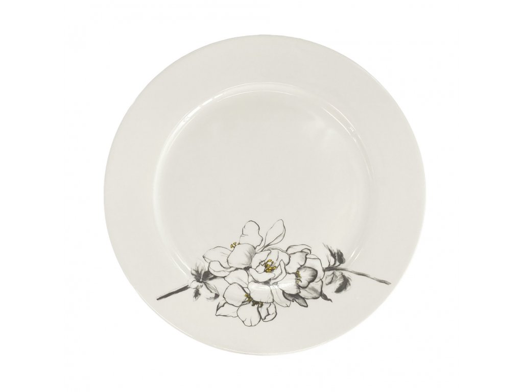 Mělký talíř Fine Twig, bílá s dekorem magnolie v šedožluté barevné kombinaci.