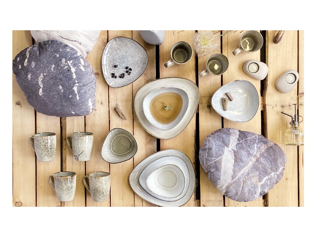Talíře a misky mají neobvyklý trojuhelníkový tvar. Okraje keramiky jsou jen jemně nepravidelné. Celobarevné keramické talíře, misky a hrnky mají převážně béžovou a šedobéžovou barvu, která je místy protkaná tmavšími odstíny šedé a hnědé. Originál keramiky ještě podtrhuje okrajová hnědá linka. Tato kolekce Triangle je postavena na originalitě a jedinečnosti každého kousku keramiky.