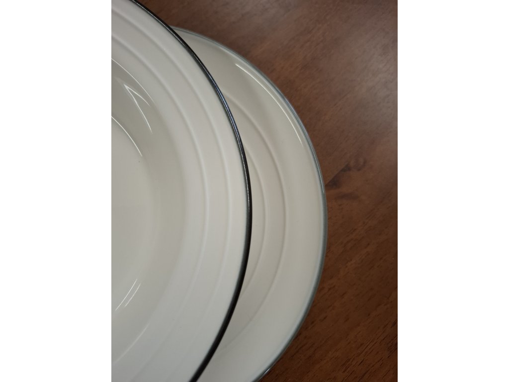 Důležité upozornění k této šarži: Tento konkrétní kus pochází ze speciálního doskladnění a vyznačuje se tmavě šedou okrajovou linkou. Odstín linky je výrazně sytější a tmavší než u ostatních produktů z řady Nostalgie (hrnky, mělké talíře či misky), které mají linku světle šedou. Právě kvůli této barevné nejednotnosti s běžnou kolekcí nabízíme talíř za mimořádně zvýhodněnou cenu. Je ideální volbou pro ty, kteří nekombinují celou sadu, nebo naopak oceňují drobnou estetickou odlišnost.