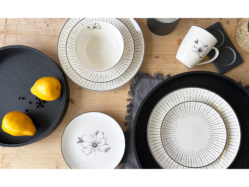 Podávejte sladkou tečku nebo snídani na talíři, který vypráví příběh. Dezertní talíř Linea Dash o průměru 19 cm se odlišuje od mělkých jídelních talířů svým jemným romantickým akcentem. Středu talíře dominuje výrazný černý květ, který je orámován čistou bílou plochou a uzavřen decentní linkou na okraji. Právě tato variabilita motivů v rámci jedné řady Dash umožňuje vytvořit unikátní porcelánový servis, který hosty nikdy nepřestane bavit.