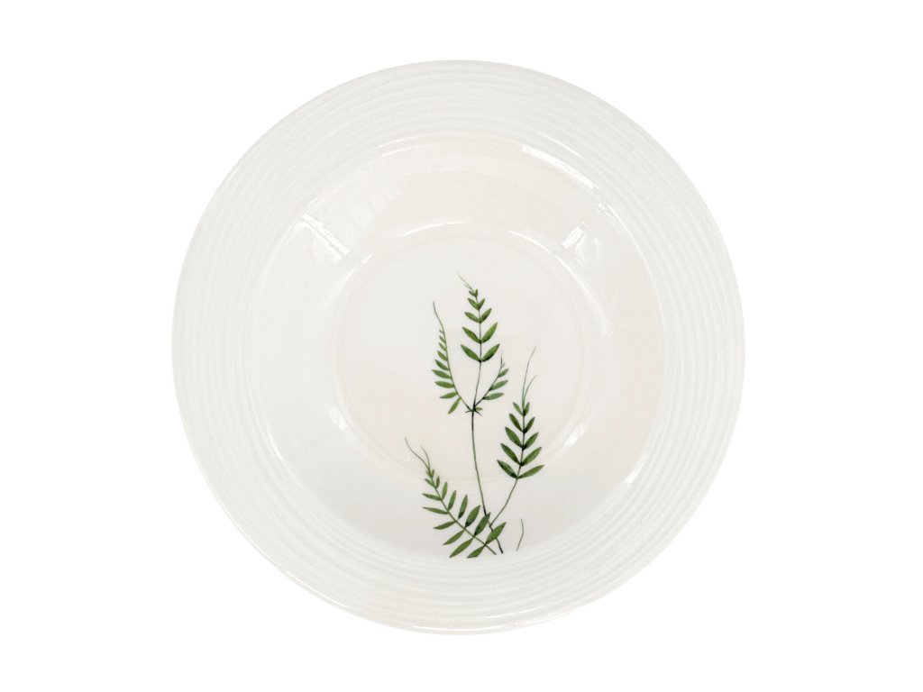 Porcelánový polévkový talíř je vyroben z kvalitního materiálu a jeho zdobené okraje dodávají stolování jedinečný vzhled. Střed talíře zdobí motiv zelených listů, které symbolizují klid a harmonii přírody.