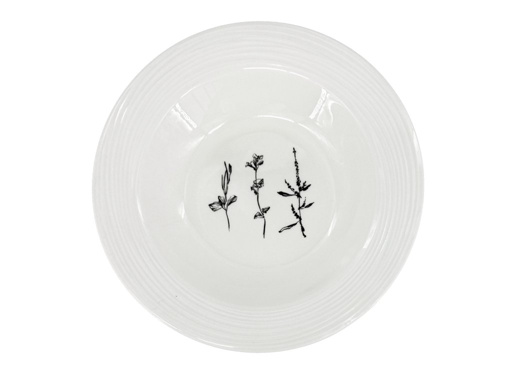 Elegantní polévkový talíř Croft Wild z porcelánu přináší minimalistický design s jemně zdobenými okraji a černým dekorem tří siluet lučních květin uprostřed talíře. S průměrem 23 cm je ideální pro servírování polévek, dušených pokrmů a dalších oblíbených jídel. Kombinace bílé barvy a černého motivu vytváří harmonický a moderní vzhled, který obohatí každé stolování. Čistý design talíře s přírodním motivem je ideální pro každodenní i slavnostní příležitosti.