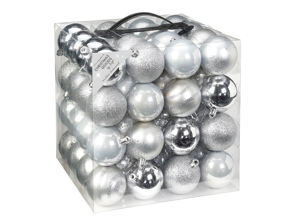 Sada 64 ks ozdob: Ozdoby kulaté stříbrné a bílé mix 6 cm