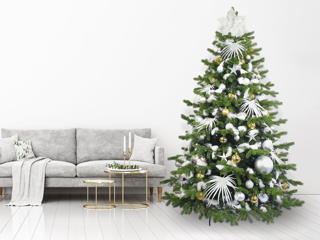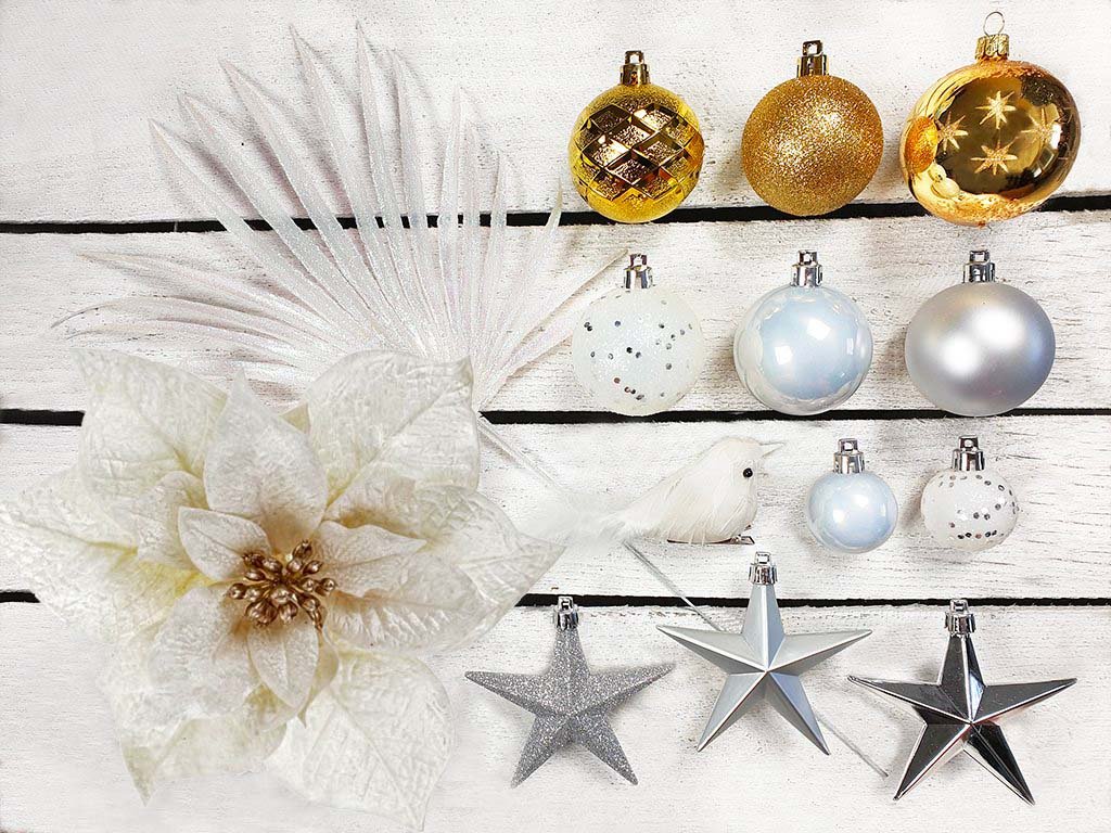 Kombinace bílých, stříbrných a zlatých ozdob v několika designech, listů s gilltery je klasickým spojením vánočních barev.