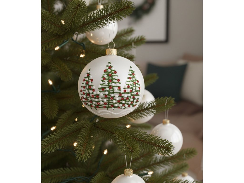 Vánoční koule Deco skleněná s jehličnany, bílá (8 cm)