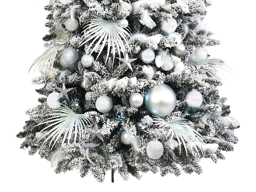 Zasněžený vánoční strom včetně 200 ks ozdob a dekorací.