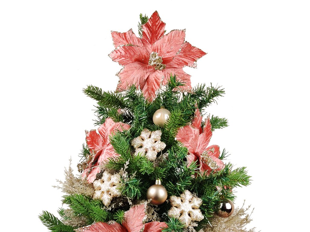 Celý stromeček zdobí elegantní květiny s decentním champagne lemem a vkusně doplňují ozdoby ve tvaru hvězdiček a kuliček.