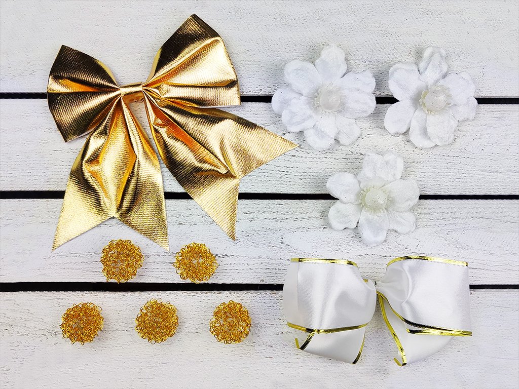 Základem sady je bílá stuha se zlatým lemem, která je propletena celým stromečkem a vytváří jemný vzhled stromečku.