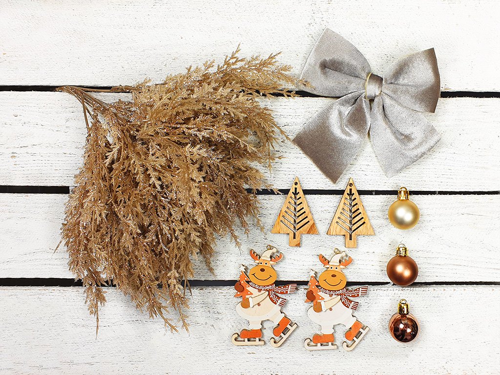 Hlavním motivem jsou dřevění sobíci s bruslemi a dekorační květiny se třpytkami.