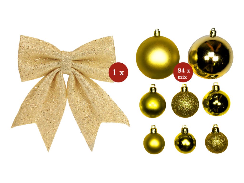 Obsahuje mix zlatých ozdob o velikosti 4 - 20 cm a také pevnou textilní mašli s glitry, která je ideální pro ozdobení špičky stromečku.