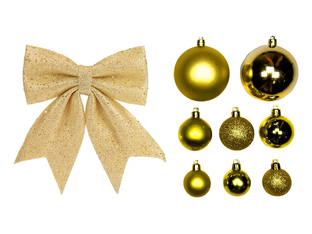 Obsahuje mix zlatých ozdob o velikosti 4 - 20 cm a také pevnou textilní mašli s glitry, která je ideální pro ozdobení špičky stromečku.
