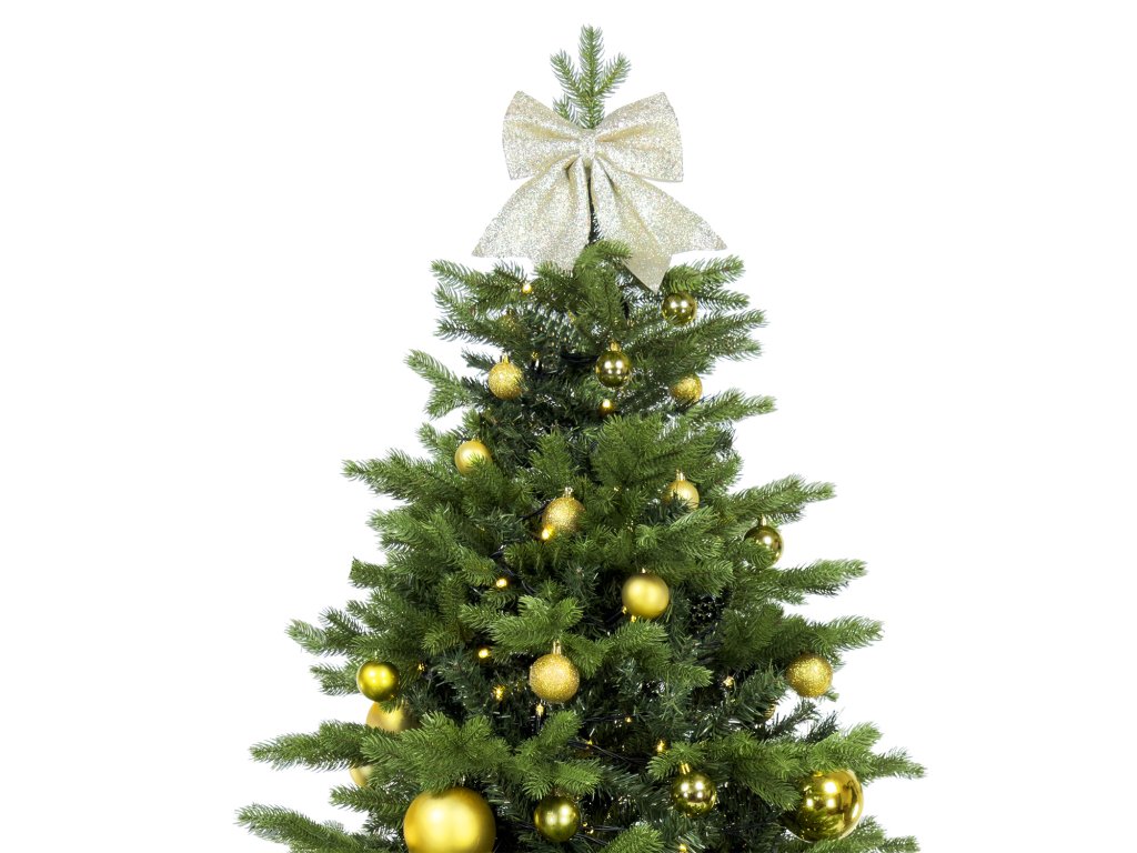 Obsahuje mix zlatých ozdob o velikosti 4 - 15 cm a také pevnou textilní mašli s glitry, která je ideální pro ozdobení špičky stromečku.