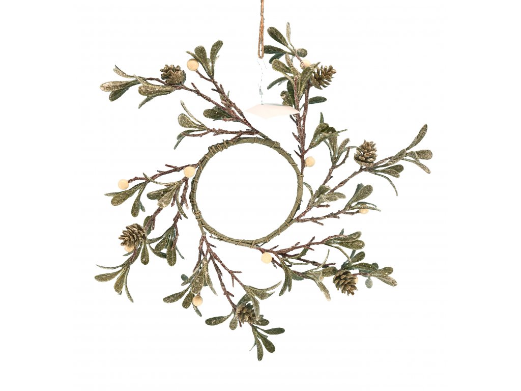 Základ věnce tvoří umělé jehličí, třpytivé červené hvězdičky a drobné červené kuličky.