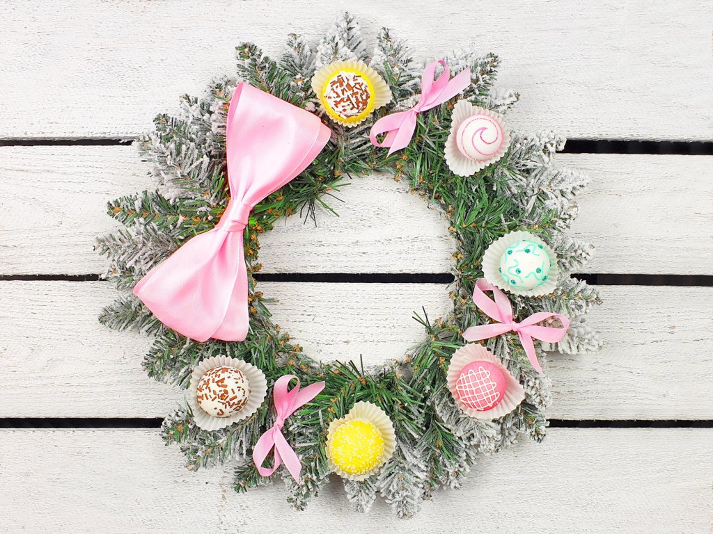 Zasněžený vánoční věnec zdobený kvalitními skleněnými přízdobami v podobě pralinek.