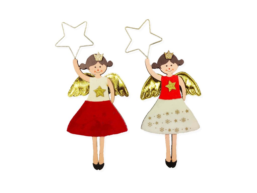 Sada 2 ks dřevěných dekorací v podobě andělů se zlatými křídly.