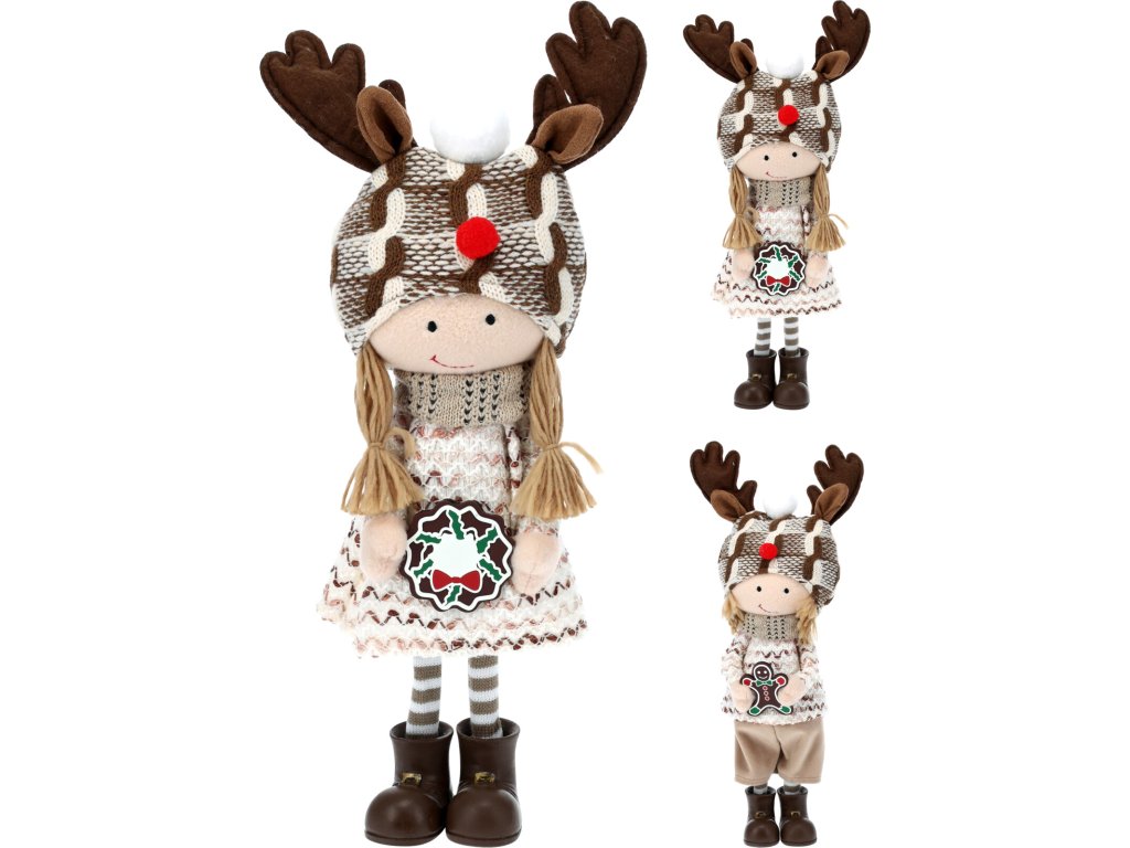 Okouzlující vánoční dekorace představuje stojící dívku s čepicí zdobenou sobími parohy. Roztomilá holčička drží v rukou věnec z perníčků.