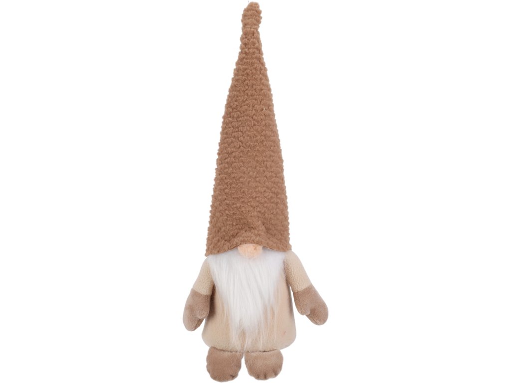 Vánoční skřítek Pixie – 10x10x32 cm, barva hnědá - béžová, materiál polyester, pruhovaná čepice s hvězdami, stylová dekorace pro vánoční výzdobu interiéru.