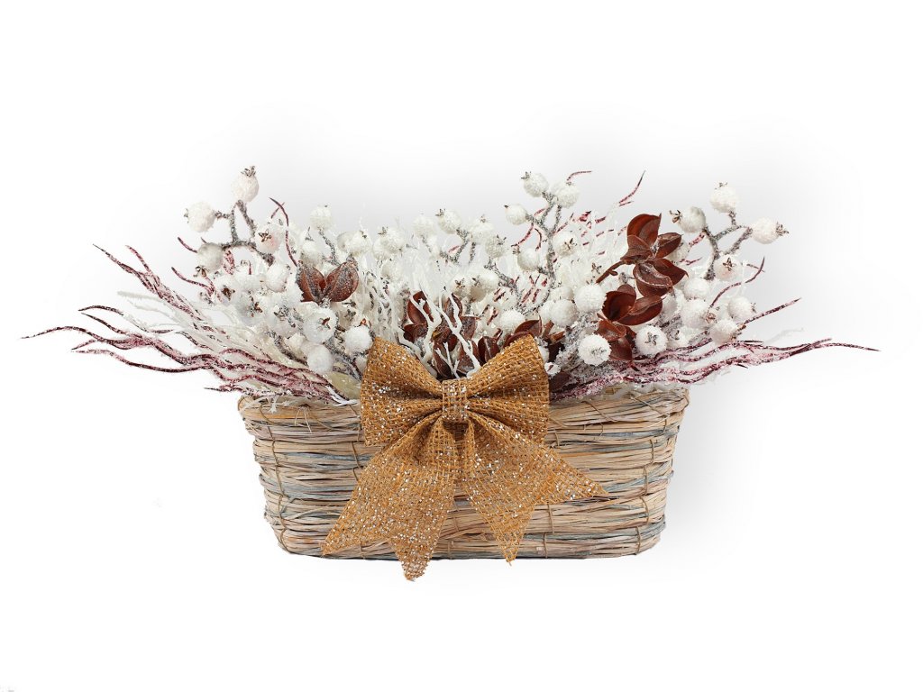 Ručně vyráběný truhlík tvořený zasněženými větvičkami a květy.