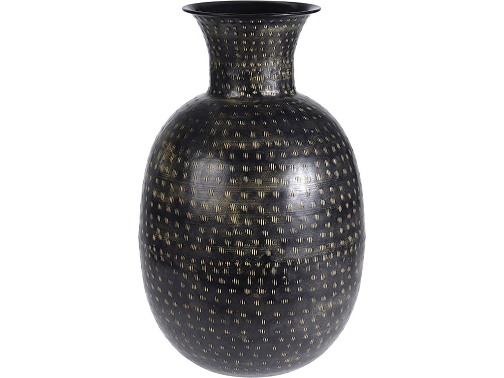 Váza má klasický soudový tvar s úženým hrdlem. Tepaný černý kov zkrášluje tak trochu ošuntělý vzhled a malé pravidelné zářezy.