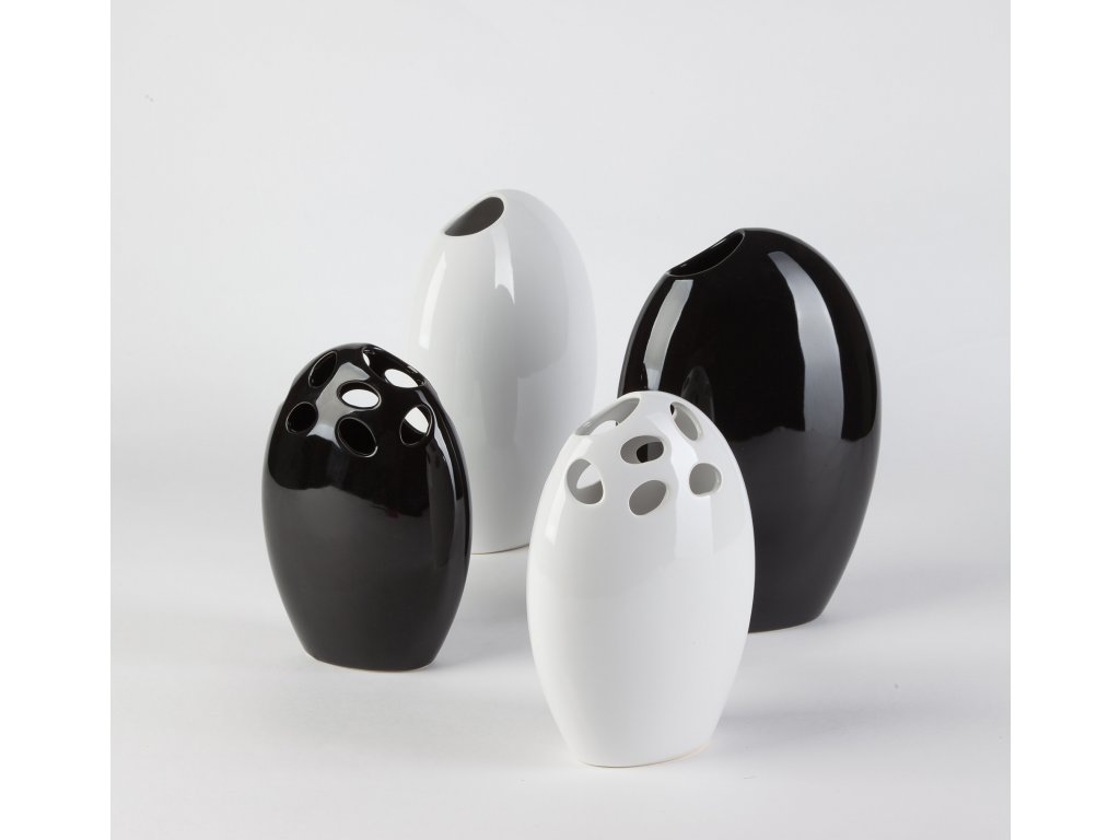 Jednoduchá váza ve tvaru vajíčka s otvorem rafinovaně navrženém na stranu. Váza je zdobena dalšími otvory, které můžete využít i na aranžmá.
