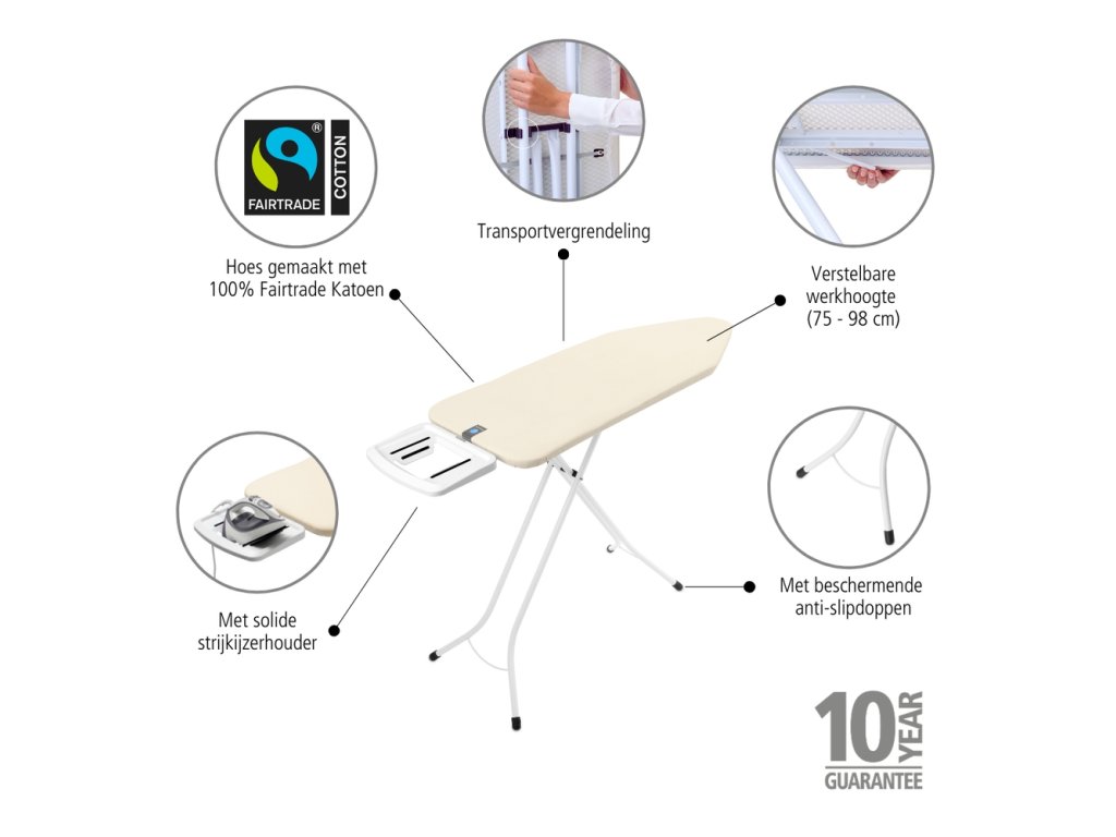 Žehlicí prkno C, 124x45cm, pevná odkládací plocha pro žehličky, bílý rám 22mm, Ecru – Velká žehlící plocha (124 × 45 cm) – ideální pro efektivní žehlení